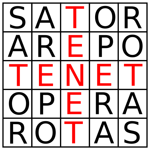 Mas qual é a peculiaridade do Quadrado mágico? Ao sobrepor uma palavra à outra, você obtém uma frase palíndromo, isto é, ele permanece o mesmo quando lido em qualquer direção.