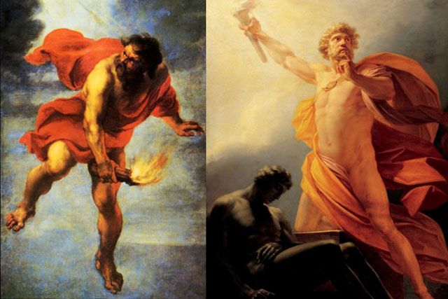 Prometeu então foi ver sua amiga, a deusa Atena, deusa da sabedoria e do artesanato, para permitir que ele entrasse no Olimpo à noite. Quando ele chegou lá, ele acendeu uma tocha com Incêndio do carro do Elio (o deus do sol) e fugiu.