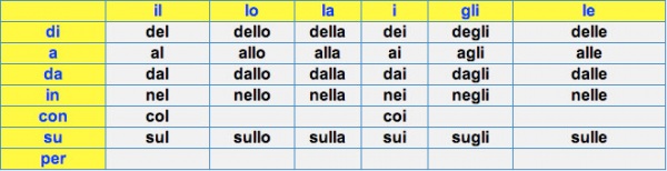 Na gramática italiana é chamado preposição uma parte invariável do discurso que cria uma ligação entre palavras e frases. A palavra preposição vem do latim “praeponere”, colocar na frente. Preposições podem ser simples e articulado. Preposições articuladas são formadas combinando uma preposição simples com um artigo definido (la la la la la la).