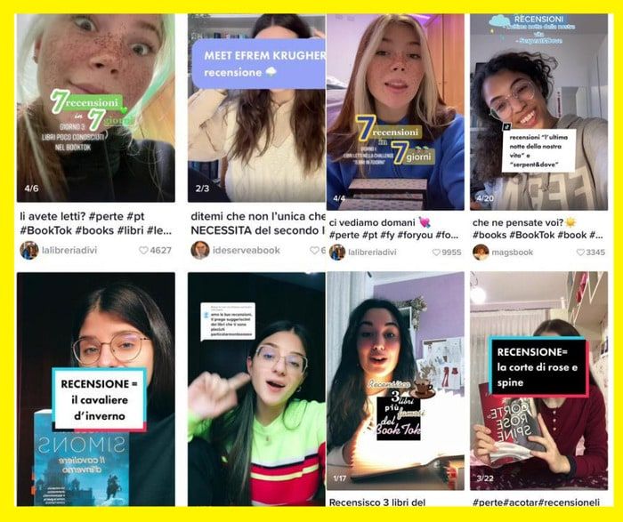 Booktoks na Itália são virais com as hashtags #booktokitalia e #booktokita e têm um total de vídeos vistos cerca de 28 milhões de vezes. Martina Levato, @Levv97, 23, começou a editar vídeos em que lê durante o primeiro confinamento. Seu perfil é seguido por mais de 75 mil seguidores. Também @centannidisolitudina, com 8.000 seguidores, vai rápido e recomenda “três clássicos com menos de 200 páginas para os amantes de leituras curtas” (The Great Gatsby, The White Nights, Young Werther). Obviamente, Harry Potter e o gênero de fantasia são ótimos.